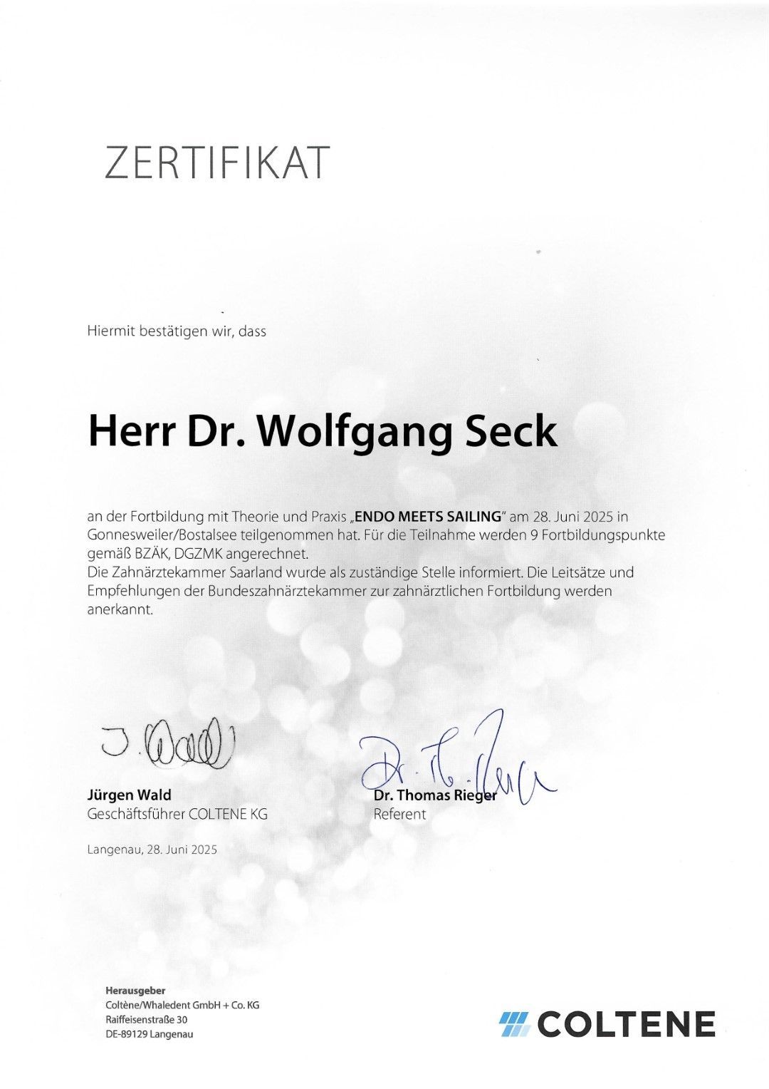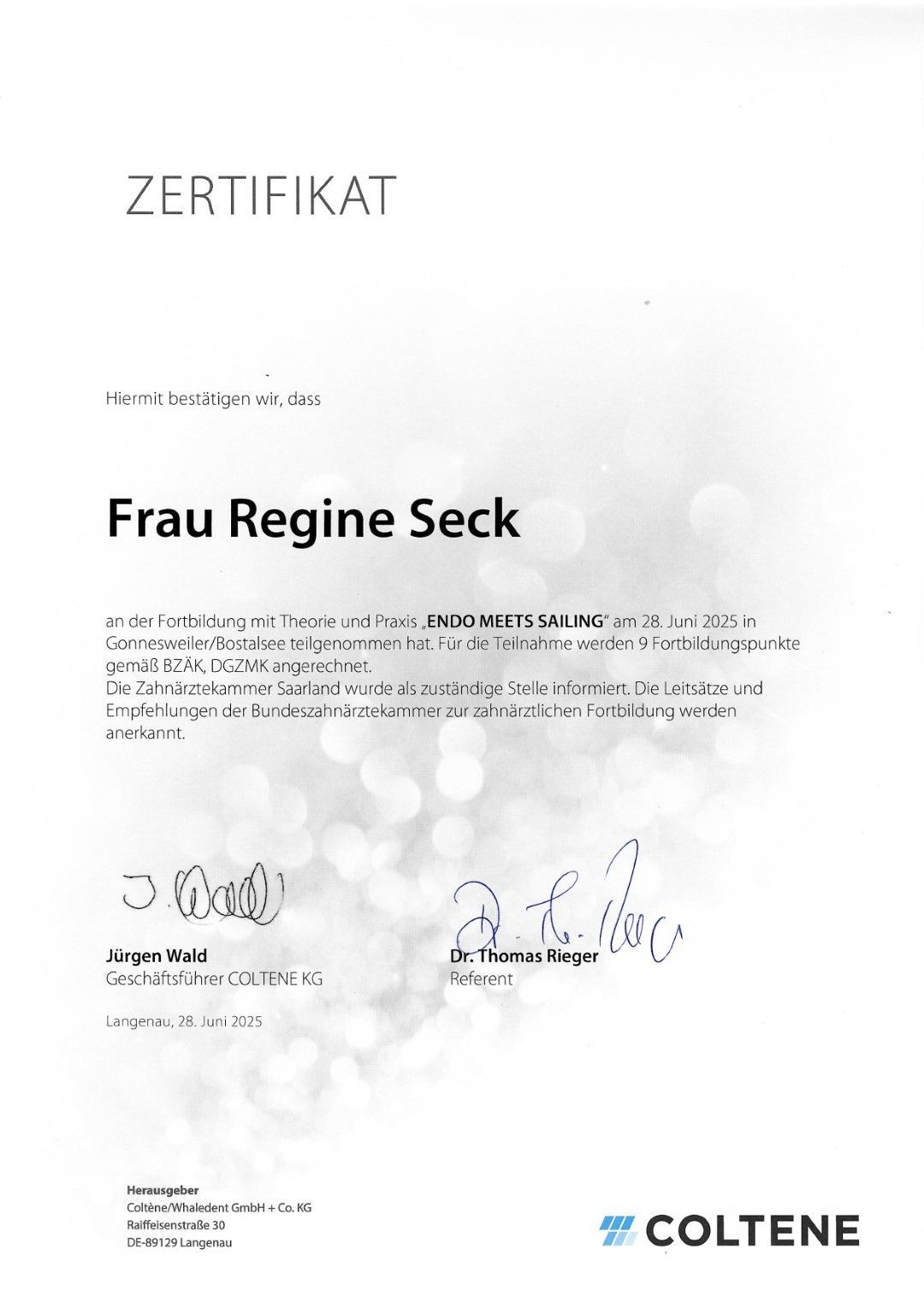 Nachdem Regine und Dr. Wolfgang Seck sich im letzten Jahr schon in Sachen Wurzelkanalbehandlung im wunderschönen Paris fortbildeten, haben Sie es wieder getan. Der Bostal See im Saarland lockte mit einer Fortbildung in Sachen Endodontie. Sie brachten neue Geräte, Materialien und Erkenntnisse mit nach Hockenheim, um die Wurzelkanalbehandlung für ihre Patienten noch effizienter und sicherer zu gestalten.